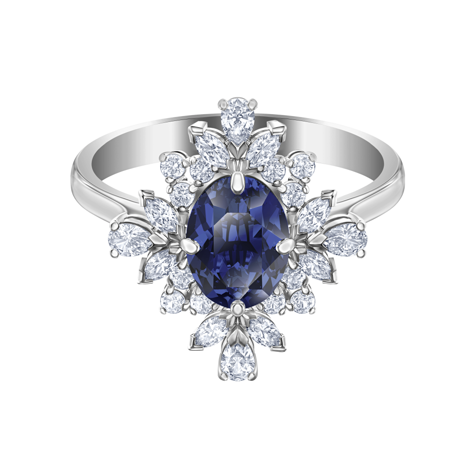 Full of vintage glamour, this timeless rhodium plated ring will fit seamlessly into any collection. Featuring a regal blue crystal centerpiece, framed with abstract floral shapes in sumptuous sparkling stones, it is an elegant and refined design. Matching items are available.