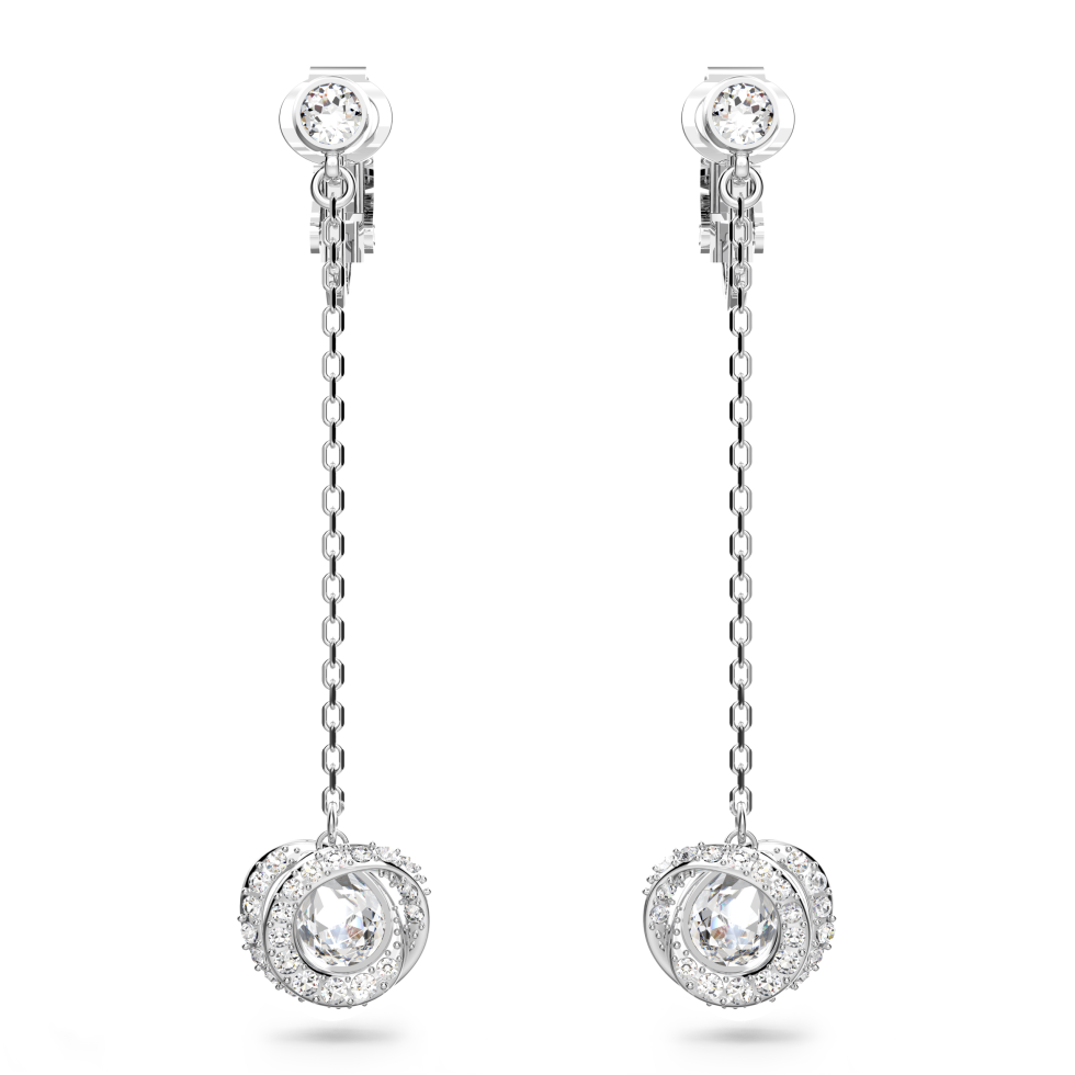 Dial up your favorite looks with these mesmerizing clip earrings. This unique design features pear-shaped crystals and dazzling pavé spirals that are suspended from a long rhodium plated chain. A statement choice for day or night. Why not gift yourself or a loved one?