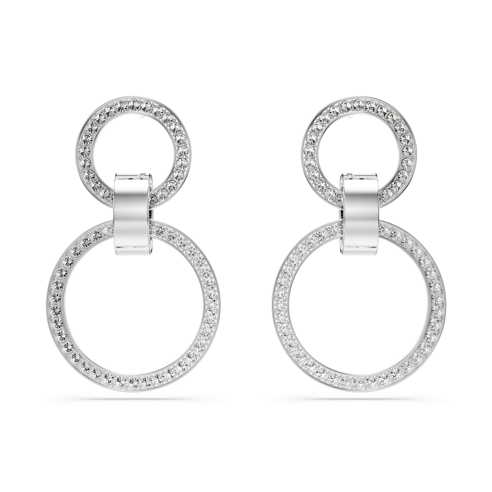 Bold and empowering, these chandelier earrings will turn heads. Interlocking rhodium plated circles are adorned with shimmering crystal pavé in a feat of meticulous craftsmanship that will elevate any look.