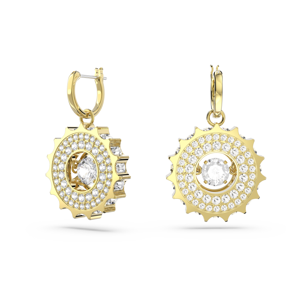 Mechanical in spirit, yet beautiful in style, these Dextera earrings are a shining example of the family’s progressive design. Each gold-tone plated piece is inspired by a gear-like shape with a mesmerizing circle of clear pavé on the front and a radiant dancing stone at the center. Individual baguette-cut stones are set between each ridge to catch the light. Combine these earrings with matching pieces from the Dextera family or wear them alone for an edgy, industrial look.