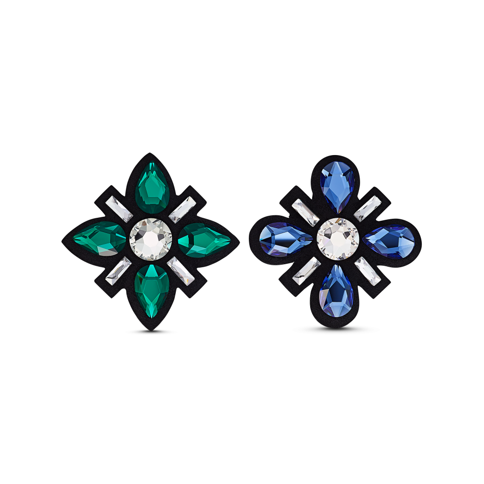 These marvelous Swarovski shoe clips offer a new, glamorous way to personalize your look. Sparkling green, blue, and clear crystals adorn black Alcantara® in a stylized floral pattern, artfully combining angular and rounded shapes. Simply attach the shoe clips to the front or the sides of your shoes. Accessorize your casual sneakers or elegant high heels for a bold but sophisticated look. A creative gift for casual occasions.