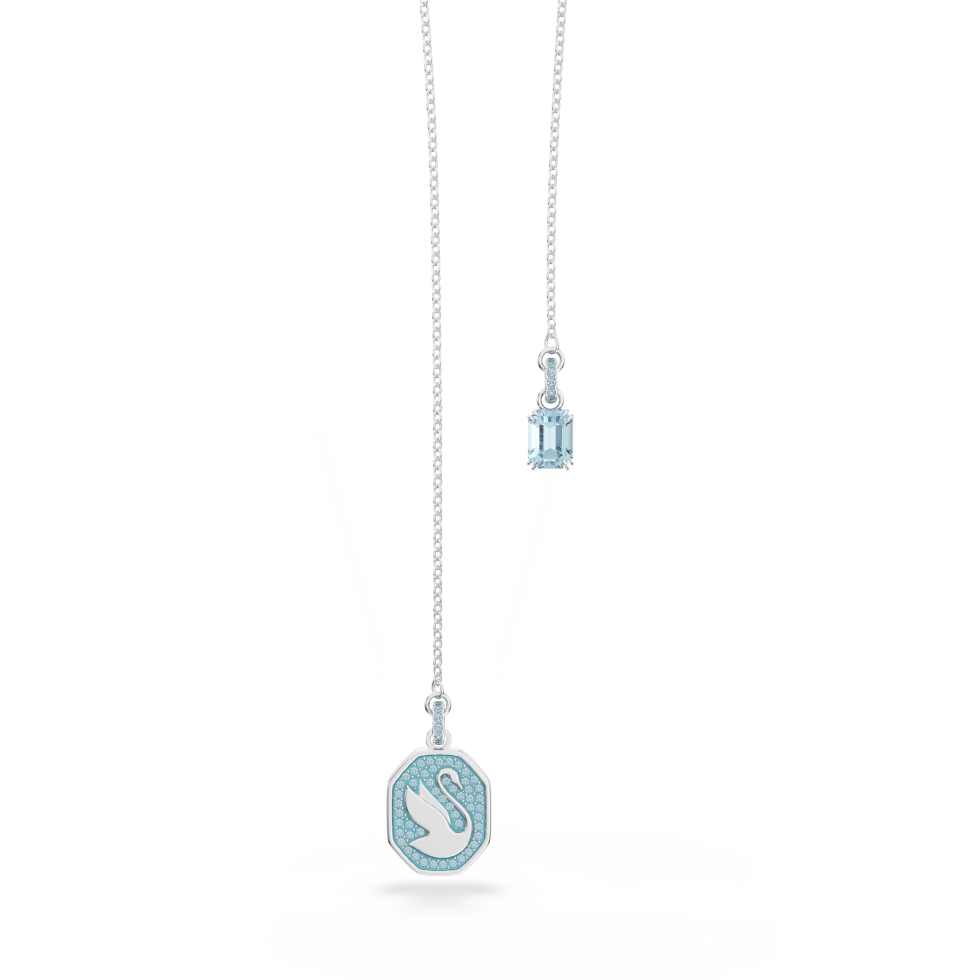 Swarovski’s signature swan and octagon emblems unite in this contemporary necklace. Embellished with a mix of aquamarine crystals and pavé, this alluring design is strung on a sleek rhodium plated chain. Style yours alone or paired with other colorful pieces from the Swan family.
