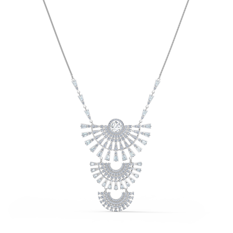 This masterful necklace by Swarovski is a display of timeless beauty, opulence, and sparkling exuberance. A shimmering, delicately faceted white stone is the center of attention, dancing in a circle of sparkling facets. Glittering stones and brilliant crystals are layered below it in three fan shapes, each one featuring a dazzling arrangement of stones in round and tapered baguette-cuts as well as round crystals. Matching stones also adorn the glittering chain closing with an adjustable sliding closure. A stunning talking piece that is ideal for special occasions, especially worn together with the matching earrings and bracelet for a truly spectacular ensemble.