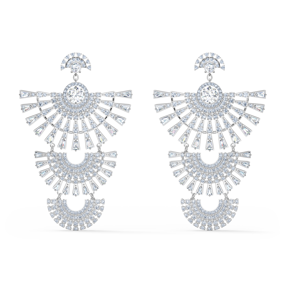 This ravishing pair of pierced earrings by Swarovski is a striking example of expert craftsmanship and faceted brilliance. Each of these marvelous earrings displays numerous sparkling white stones and clear crystals in three fan-shaped arrangements, one featuring a gleaming white dancing stone in its center. Dangling from a fourth, smaller glittering fan shape, this pair of earrings reflects incoming light brilliantly into a spectacular display of sparkles. Wear this talking piece with the matching necklace and bracelet and you are certain of a grand entrance at special occasions.