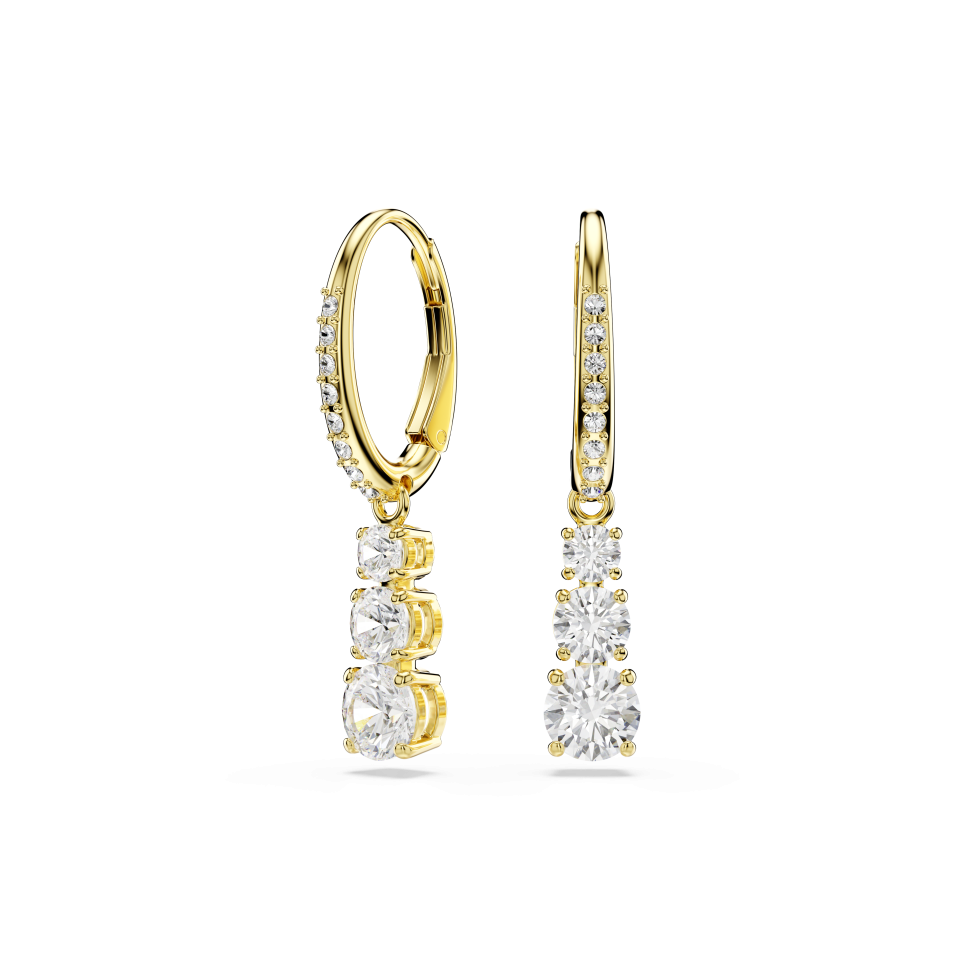 These stunning pierced earrings are crafted with the eternal concept of romance in mind. Each piece features a trio of clear Swarovski Zirconia in a gold-tone setting, with a scintillating decoration of pavé on the hoops. Timelessly elegant, they will make a treasured keepsake. Combine with a matching necklace or ring to maximize the effect.