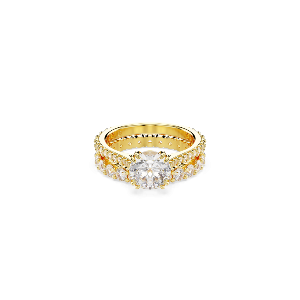 Reflecting the beauty of the cosmos, this spectacular jewelry inhabits its own light-filled universe. The gold-tone plated design combines a band ring adorned in pavé with a solitaire ring, also featuring pavé, with a large Swarovski Zirconia at the center. A radiant gift that beautifully captures Swarovski’s signature savoir-faire.