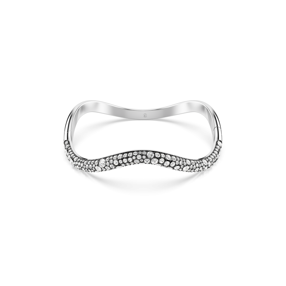 Echoing the undulating ocean waves, this Sublima bangle embodies dynamic elegance. Its flowing shape is adorned with a pavé of clear crystals set in a ruthenium plated base, with rhodium plating behind. The Meteora pattern of differently sized crystals provides a unique and dazzling effect. A fitting tribute to the marine landscape that will infuse any look with tranquility.