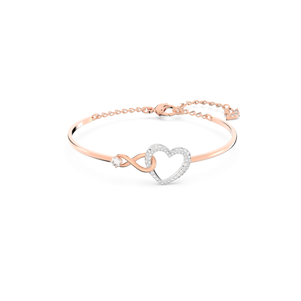 A symbol of infinite love: This elegant Swarovski bangle showcases the symbols of love and eternity entwined with each other. Embellished with white Swarovski crystals, the heart motif perfectly complements the infinity symbol for a truly romantic look. A mixed metal finish balances warm and cold tones perfectly to complete the design. It is a wonderful gift – and a promise – for a special person.