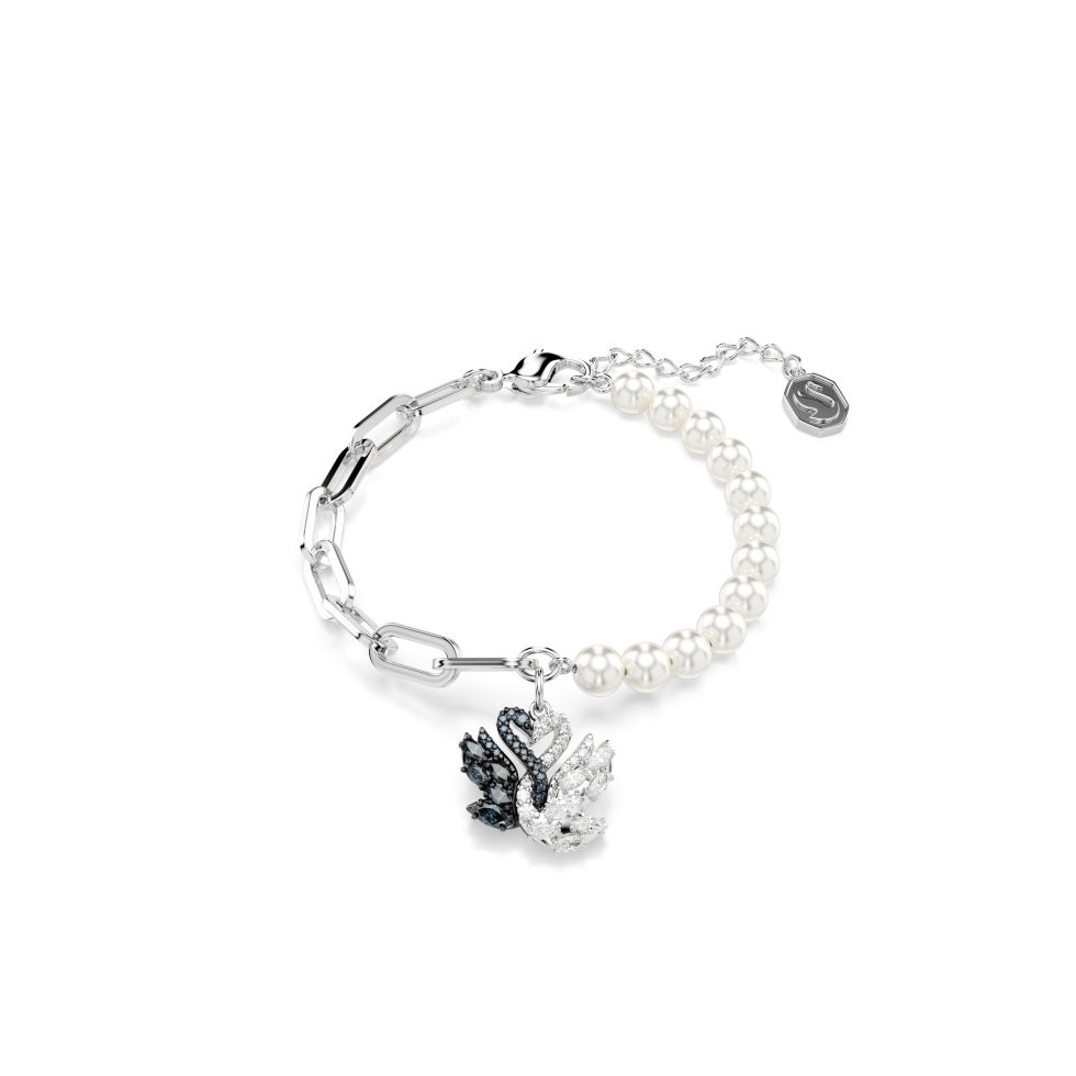 Ideal for self-expression, this stunning bracelet is split between a delicate chain and a strand of white Swarovski Crystal Pearls, with an elegant swan motif that hangs at the center. This iconic emblem showcases two intertwined swans, in rhodium and ruthenium plating, with an all-over decoration of black and white Swarovski Zirconia in round and marquise cuts. A beautiful starting point for your own personalized style.