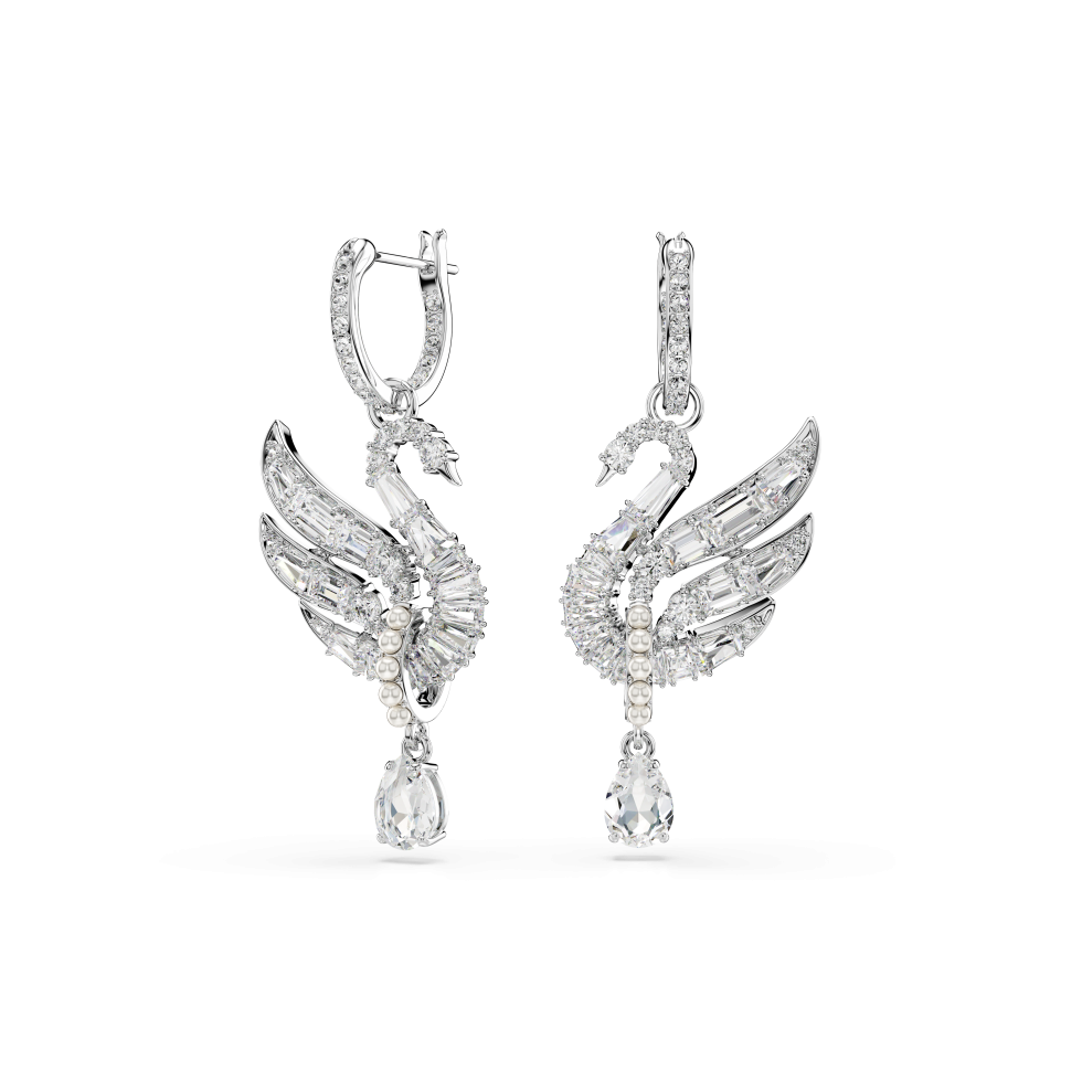 Joyful, elegant, and radiant, these earrings are a celebration of the iconic Swarovski swan. Attached to a mini pavé hoop, each rhodium plated piece is adorned in clear Swarovski Zirconia and features a single pear cut that hangs from a pavé hoop of Swarovski Crystal Pearls. Wear them alongside the matching pendant for a look of pure sophistication.