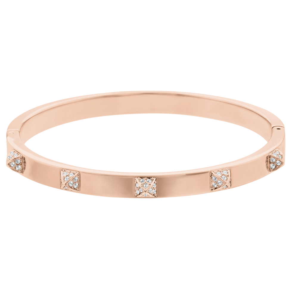 Ideal for fashion lovers! This rose gold PVD bangle honors the thin bangle and spike trends. Embellished with clear crystal pavé, its sleek and modern silhouette combines well with other bangles or bracelets to create an on-trend stacked look.