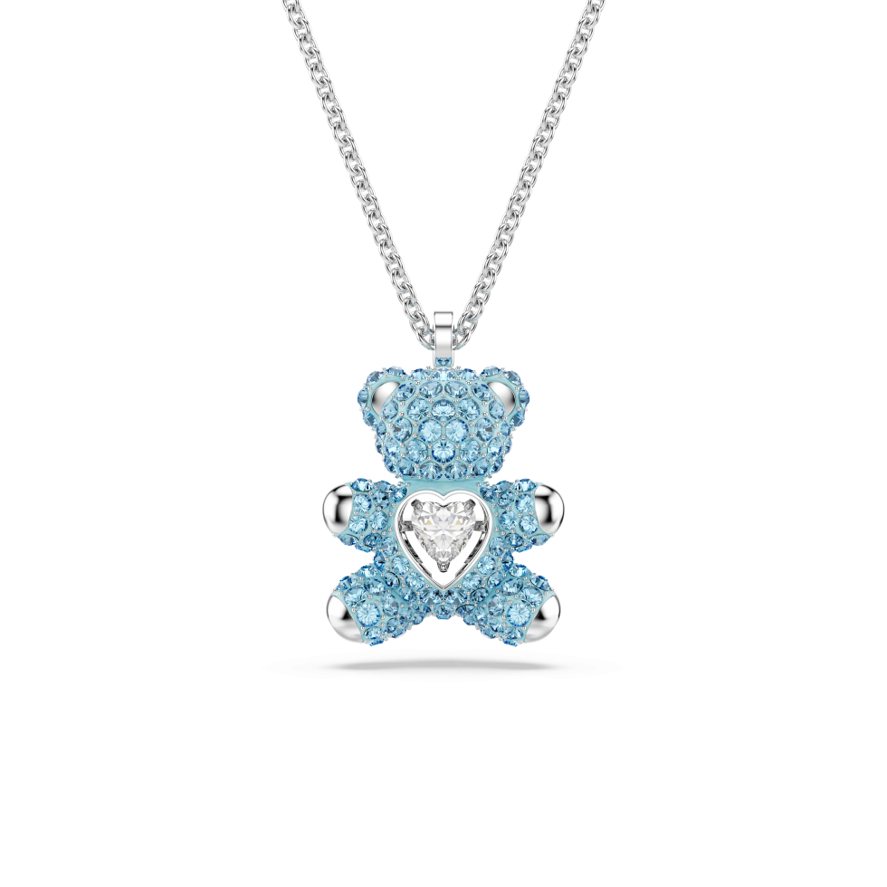 Inspire a smile with this playful pendant. The 3D teddy is covered in blue crystal Pointiage® and holds a heart-shaped dancing stone in a clear tone. Finished with a rhodium plated chain, this unique design encapsulates happiness and love.