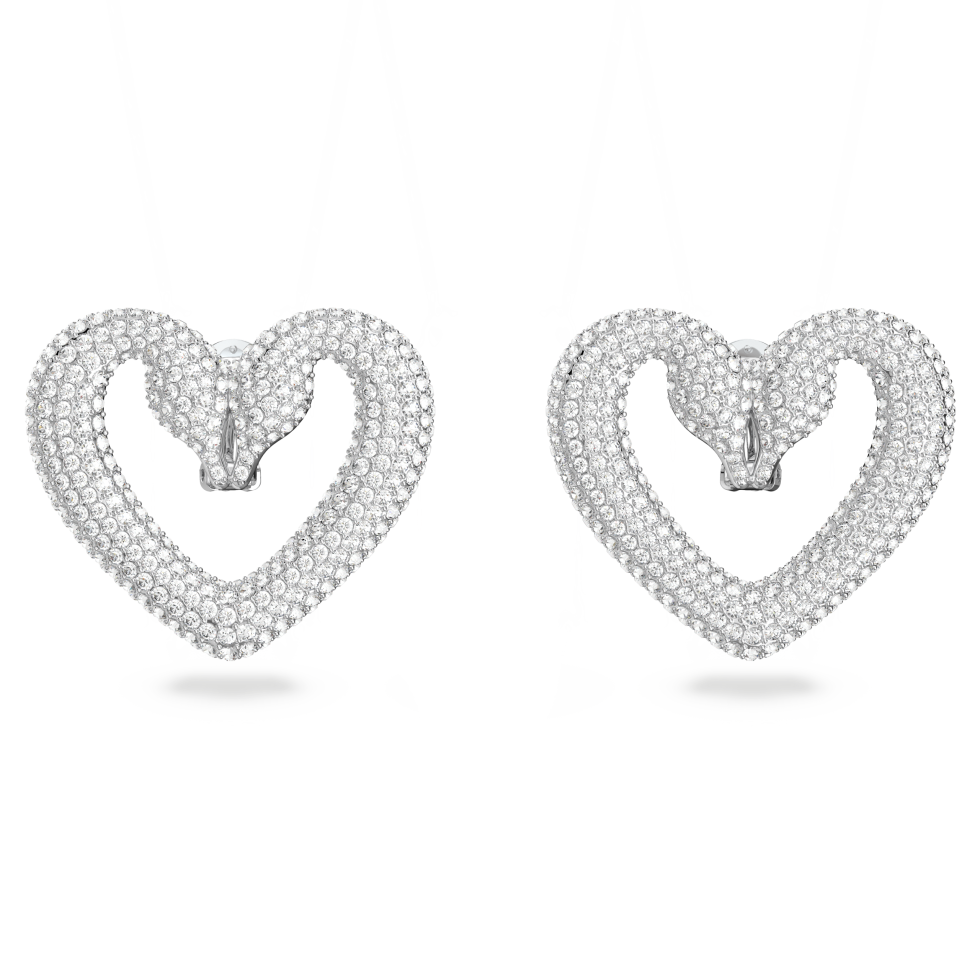 Sublima clip earrings, Heart, Large, White, Rhodium plated