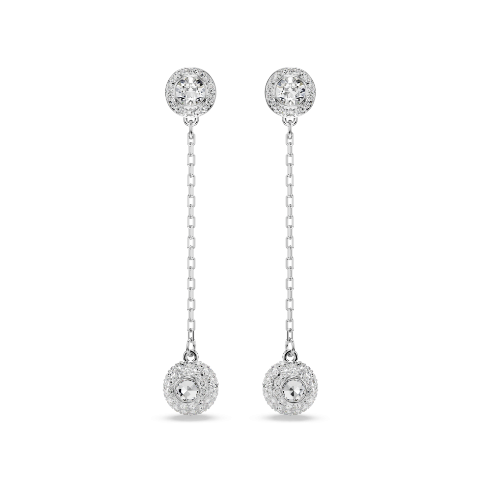 Radiate wonder with these shimmering Swarovski earrings. Each rhodium-plated piece features a long chain connected to a double-sided motif, offering a different display of round-cut crystals on each side. The hanging motif can also be connected to the back of the stud for a versatile wearing option. Mix and match with other Una Angelic pieces for a look of ultimate radiance.