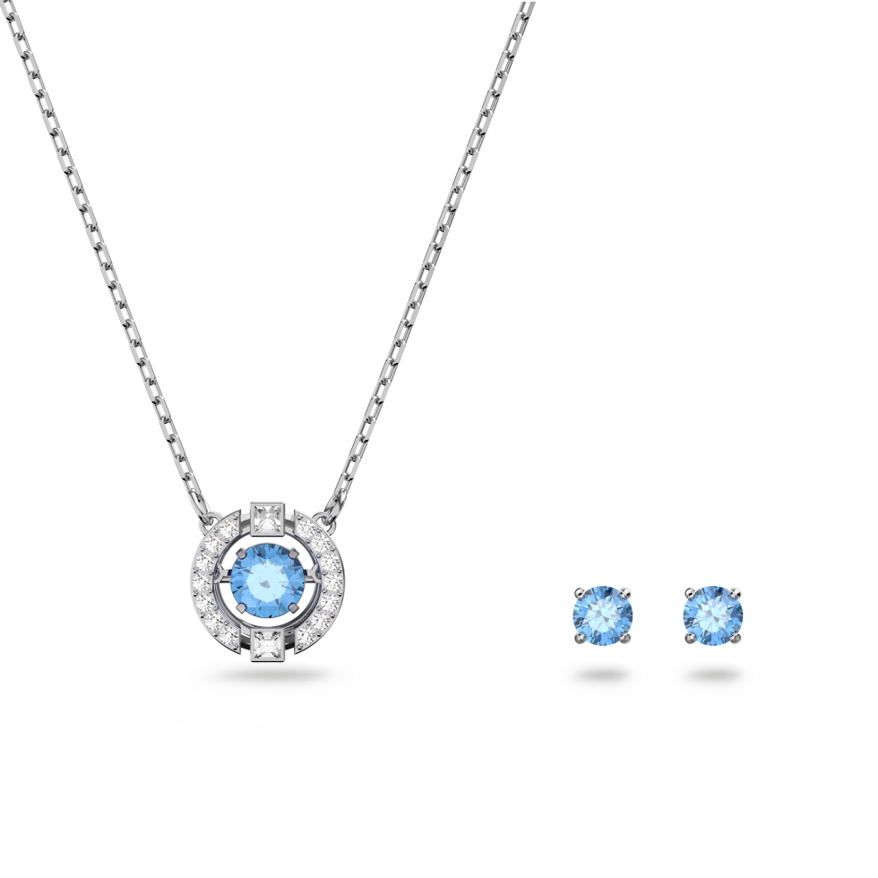 Present a thoughtful gift this Mother’s Day with this timeless set, which includes a pair of stud pierced earrings and a necklace. Refined and elegant, it showcases Una’s innovative ‘dancing crystal’ design concept, with a circular motif in pavé enclosing a floating sparkling pastel blue stone. Plated in rhodium, it is luxurious with a playful touch.
