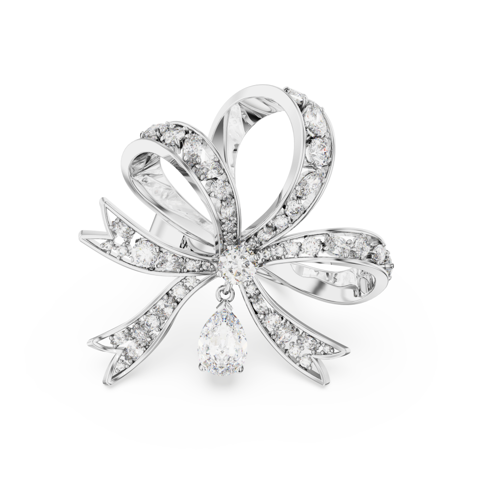 Tied up in effortless style, this unique Hyperbola cocktail ring puts elegance directly in your hands. The bow-inspired design is rhodium plated with an array of bright clear crystals set in place using the chattonage technique. Two large stones also add to the effect with a round stone at the center of the bow, and a separate pear-shaped embellishment which hangs beneath. Wear this ring for a statement of modern elegance, or present it as the perfect romantic gift.